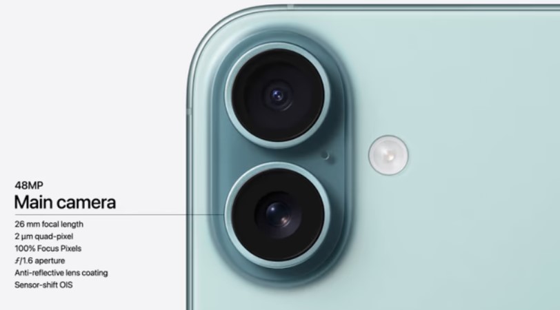 iPhone 16의 카메라는 48MP(4800만 화소)의 메인 카메라와 초광각 카메라로 구성되어 있다. 메인 카메라는 2배 줌이 가능하며, 동영상 촬영은 4K 60FPS까지 가능하다.
